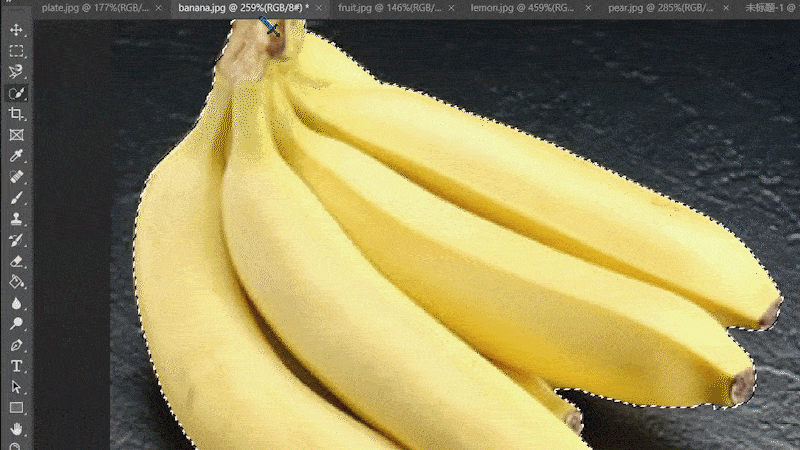 使用 Alt + 鼠标滚轮 缩放画布,再次利用 快速选择工具 单击 色差较大的边缘将 整个香蕉 划入选区