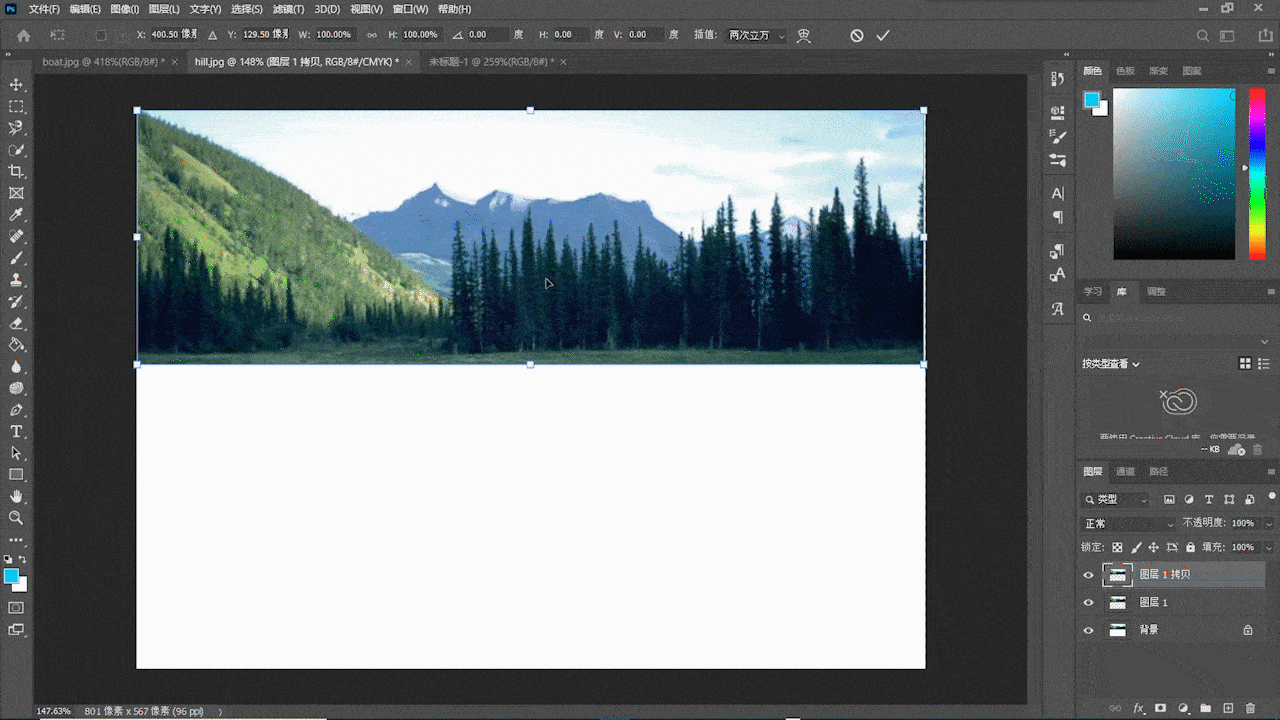 使用 移动工具 工具栏第一个 将 船 往画布中心移动后