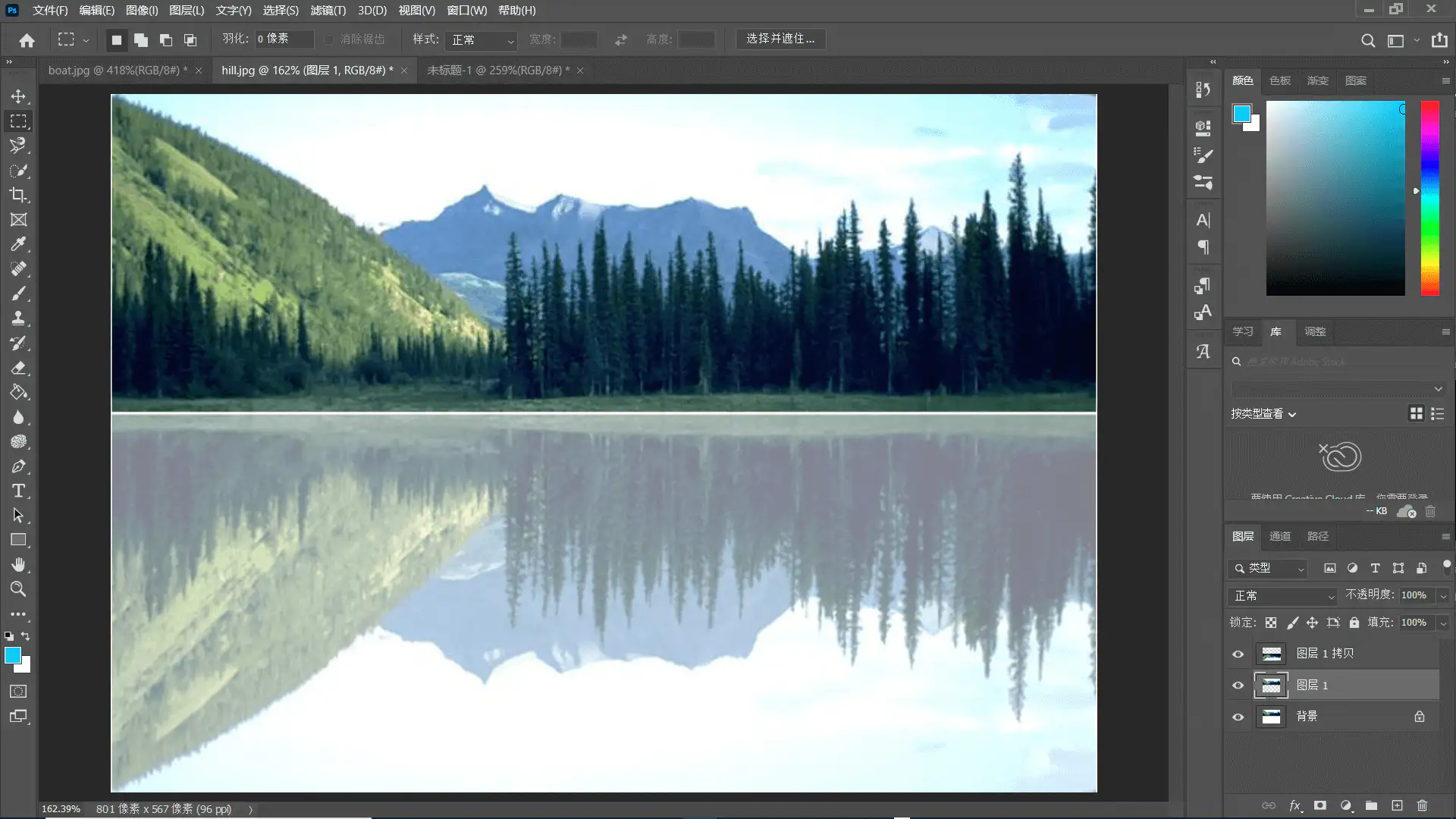 修改 图层 1 拷贝 透明度为 50% 以模拟水面倒影