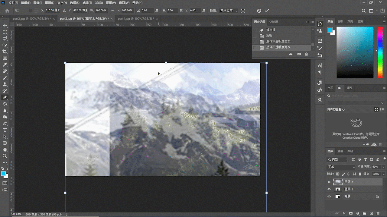 修改 图层 2 透明度为 60% 左右,使用 Ctrl T 自由变换移动并对齐图层,可以使用方向键进行微调